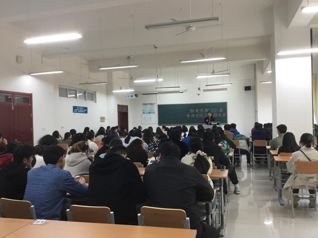 会议伊始,学院负责人针对2017级面临考研复试及调剂的学生给予鼓励和支持,并就复试、调剂前工作的提出合理的建议。要求同学们瞄准目标、找准方法,认识考研大环境找准正确的方向,通过多种渠道收集考研信息及情报,做好复试准备关;劳逸结合、养精蓄锐,专注于复试科目的复习,把状态调整到最佳。随后,分管辅导员根据考研初试成绩对考研形式进行分析,提醒考生对收集的有效信息及资源进行合理的汇总、研判,同时结合历届考研案例典型鼓励同学们增强信心,按部就班做好准备工作。最后,学生提出在备考过程中所遇到的问题,各系主任和班主任进行了耐心解答,并提出,根据同学们的考研情况收集了复试考试科目,并为每一门科目配应辅导老师,物电学院将提供全方位的服务,助考生一臂之力。
