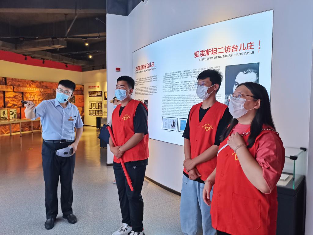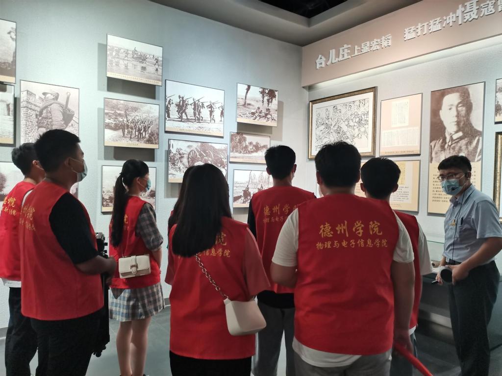 在此次三下乡活动中,志愿者们参观了台儿庄大战纪念馆,追寻中国革命的足迹。在参观过程中,每位成员都在认真聆听讲解员的讲解,认真学习这段革命历史及革命精神,同时志愿者们观看台儿庄大战的影视资料,了解战争背景,进一步理解台儿庄大战的革命成果及其影响。在深刻学习、了解更多关于台儿庄大战的历史之后,志愿者们无不为之震撼,更加坚定了“永远跟党走”的信念。随后,志愿者们在台儿庄大战纪念馆和贺敬之柯岩文学馆进行了志愿服务,维持现场秩序,并将党史知识介绍、传递给游客。通过党史志愿讲解这样的形式,可以让党员、团员青年,更主动、更积极的学习党史知识,更直观、更准确的掌握党史知识,更透彻、更深人的理解党史知识,真正做到学史力行。同时把我们对党史的所学、所思、所悟,传播给广大群众让更多人了解感悟我党的百年历史,形成更加广泛的政治认同、思想认同、价值认同、情感认同,在党的领导下,凝心聚力奋力开启全面建设社会主义现代化国家新征程!