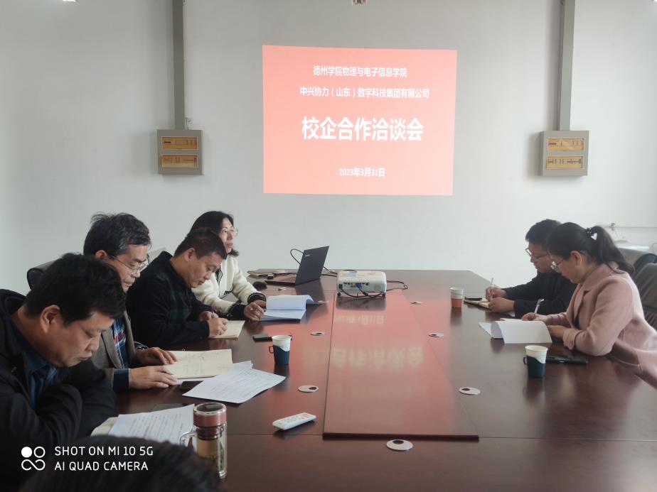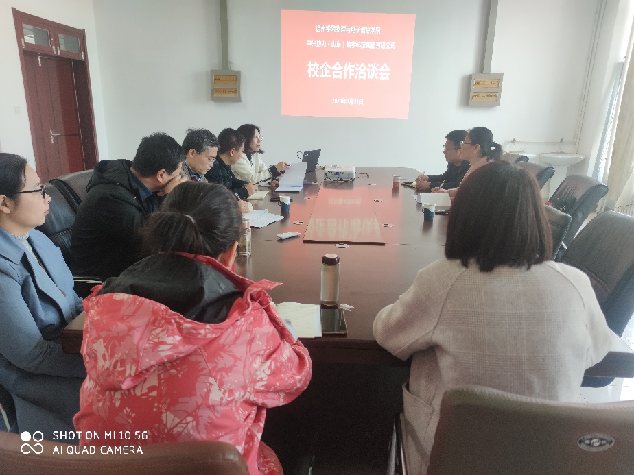3月31日上午,久久久久久无码精品大片与中兴协力(山东)数字科技集团有限公司在启智楼0410举行了校企合作洽谈会。中兴协力产教融合部市场总监胡浩、中兴协力物联网专业教学主管郑昆,德州学院教务处副处长赵光胜,物电学院领导班子成员及物联网工程系主任等参加了会议。