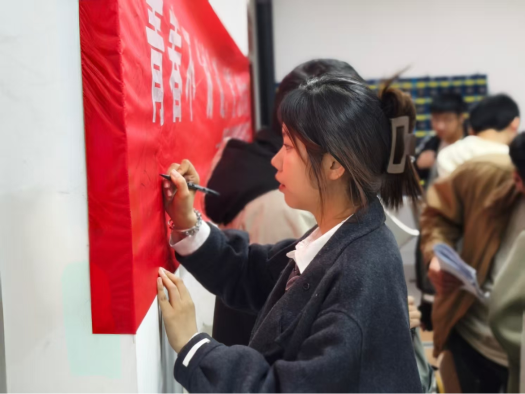 分享环节结束后,同学们结合电子信息工程专业特色,分组讨论了诚信理念在专业学习、科创实践及未来工作中的体现与重要性。赵老师对不诚信案例进行分析,以学术不断、网络谣言等社会案例警示同学们“失信者寸步难行”。班会还设置了诚信手抄报及诚信摄影展示,鼓励学生以创意表达对诚信的理解。最后,学生们认真签署诚信承诺书,并由赵老师领誓进行“诚信宣誓”,承诺“内诚于心,外信于人,从学业到生活践行诚信准则”。班会结束后,同学们纷纷在诚信横幅上签名,信诺留痕,留下对诚信的坚定承诺。