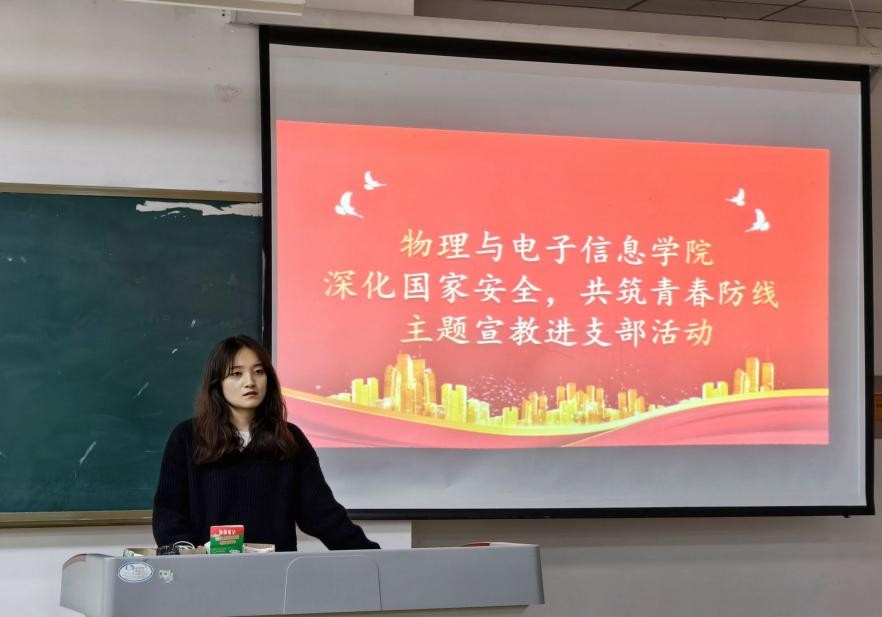 为深入贯彻落实总体国家安全观,增强学生的国家安全意识,4月18日,物电学院在明理楼225成功举办了“深化国家安全,共筑青春防线”主题宣教进支部活动。