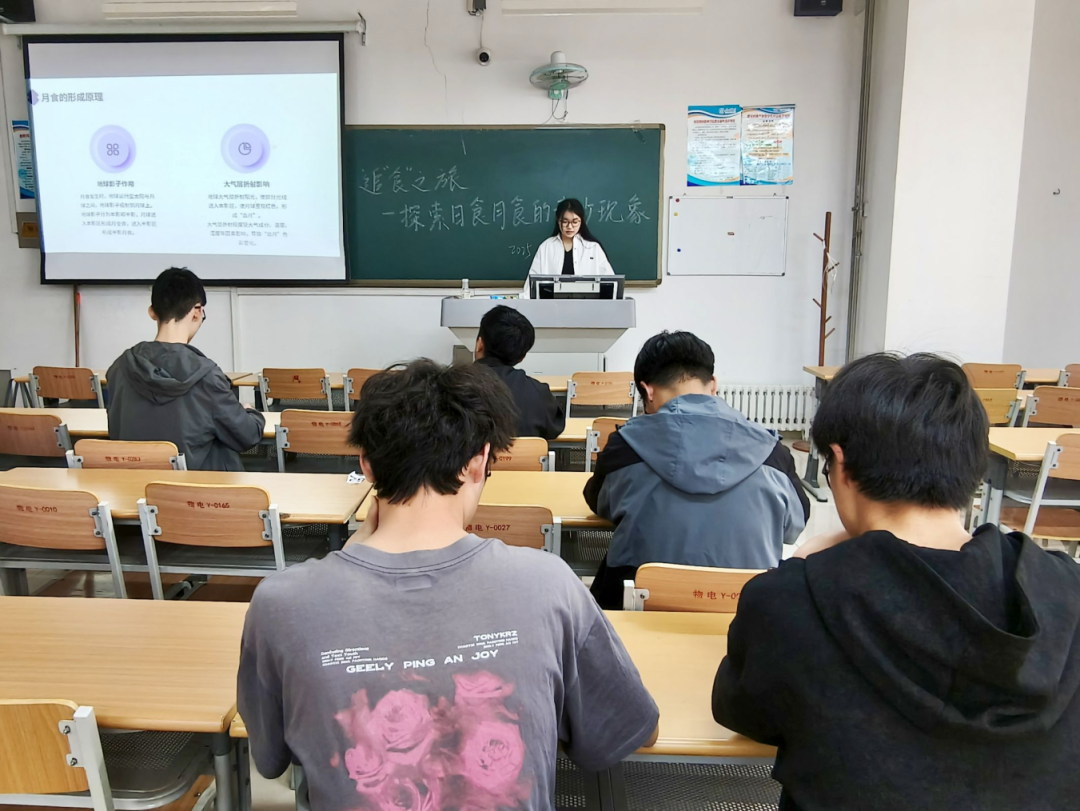 活动中,主讲人以“钻石环”“血月”等震撼影像为引,对比古今对日月食的认知差异,简明阐释其科学原理。针对观测,主讲人强调日食需借助专业眼镜或小孔成像投影以保护眼睛,月食可直接肉眼观测,搭配望远镜能捕捉月球表面细节,并提醒关注天气与保暖。此外,活动还介绍了约18年11天的“萨罗周期”等周期规律,结合文学记载与民间传说,点明日月食在文化传承及太阳大气、月球地质研究中的价值。现场气氛热烈,同学们或是专注记录,或是热烈讨论,沉浸在天文知识的海洋中。
