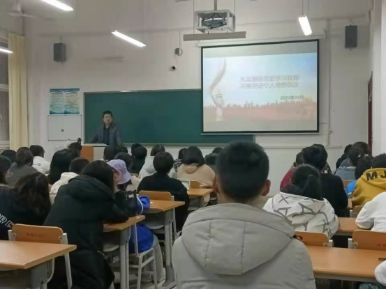 为促进党史学习教育进一步走深走实,坚定大学生理想信念,不断提高大学生思想政治素养,11月6日下午,物理与电子信息学院党委副书记申青林在明理楼0227教室为2021级物理学全体同学开展思政教育课。