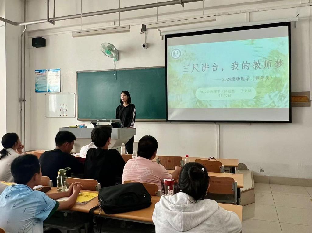 为大力弘扬教育家精神,引导广大师范生坚定从教信念、厚植教育情怀,9月10日下午,久久久久久无码精品大片在求真楼0110教室开展24级物理学师范生“我的教师梦”主题演讲活动。学院团委书记贾延琨 、辅导员赵剑桥、宋言昕 参加。