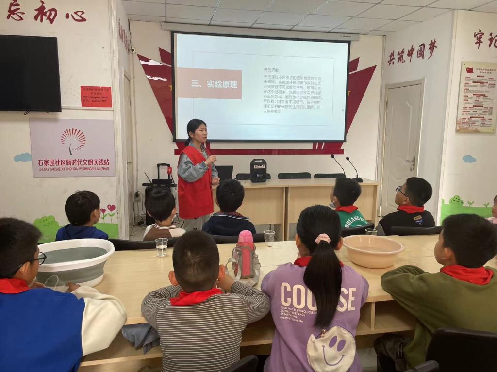 活动伊始,志愿者为小朋友们普及了实验中所涉及的光的折射、摩擦力等相关物理知识。随后,志愿者带领社区的小朋友们一起动手操作了“消失的硬币”、“筷子的神力”、“反冲喷泉”等多项趣味科学小实验,让孩子们近距离地感受到了科学的魅力,营造了爱科学、学科学、用科学的良好氛围。
