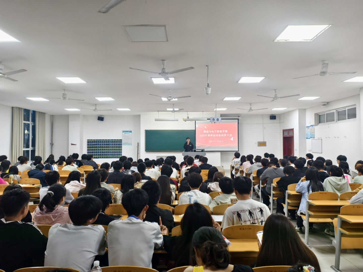 学院高度重视师生体育运动工作,坚持“五育”并举,提早谋划准备,运动会筹备期间,学院立足于往届的成功经验,制定方案、成立专项小组,明确分工、协调工作,扎实推进运动会各项工作。学院领导多次慰问运动员、方阵队、排舞队等,送上温暖关怀;训练小组从体能强化到技能提升,为运动员量身定制科学训练方法;后勤保障小组精心准备运动装备、营养补给,保障训练、竞赛顺利进行;宣传小组通过海报、公众号等平台营造浓厚赛事氛围,全院上下通力协作,为赛事顺利开展保驾护航。4月16日晚,物电学院在明理楼227召开2025年校田径运动会动员大会,团委书记贾延琨明晰校运会意义,同时结合个人经历和自身经验,激发同学们的参赛热情,与运动员们共话赛前准备、竞赛技巧、运动保护等注意事项,督促运动会各项工作顺利开展。