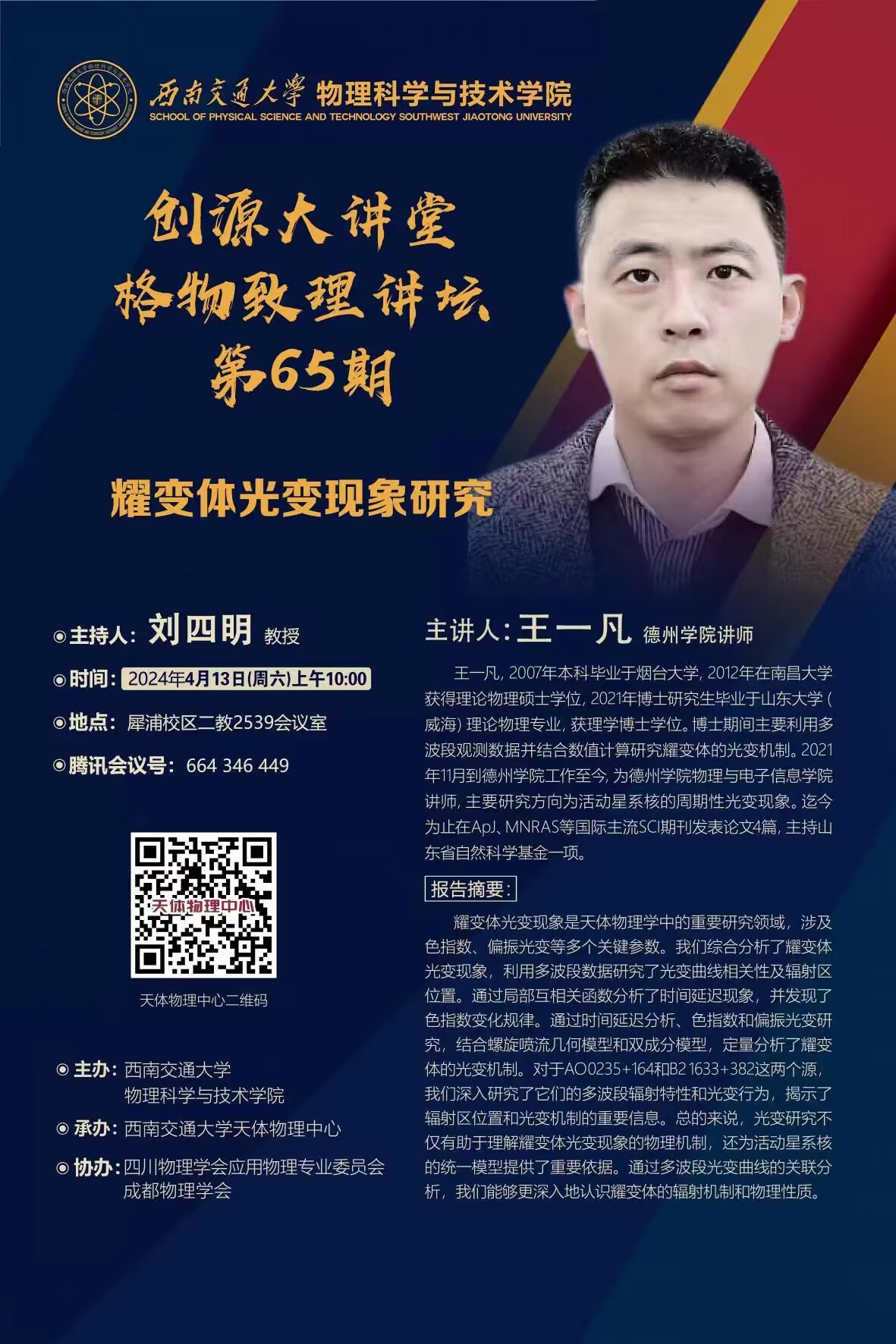 4月13日,久久久久久无码精品大片的王一凡教师应西南交通大学刘四明教授邀请前往开展学术交流并作了题为“耀变体光变现象研究”的学术报告。