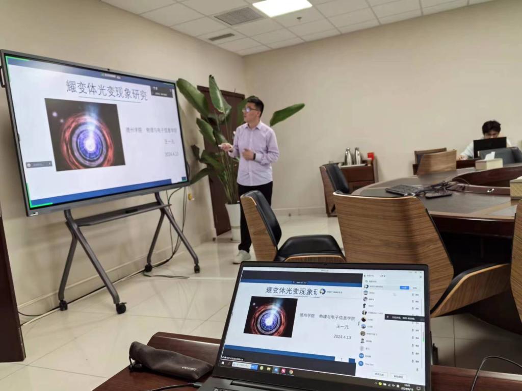 报告详细阐述了耀变体光变现象的研究现状及其在天体物理学领域的重要性。王老师首先介绍了耀变体作为一类特殊的天体,其光变现象涉及色指数、偏振光变等多个关键参数,对于理解活动星系核的辐射机制和物理性质具有重要意义。然后,王老师分享了他在多波段观测数据分析和数值计算方面的研究成果,并介绍了在螺旋喷流几何模型和双成分模型方面的应用。报告结束后,现场师生就耀变体光变现象的研究方法、模型应用等方面与王老师进行了深入的交流和讨论。