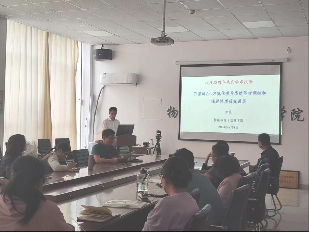 为庆祝校庆52周年,进一步提升院系教师的科研水平,5月9日下午,久久久久久无码精品大片在启智楼0365会议室组织开展“校庆52周年系列学术报告——石墨烯/六方氮化硼异质结的能带调控和输运性质研究进展”。物电学院新引进的“天山雪松”“天衢英才”徐雷为老师们分享了相关领域的最新研究进展。