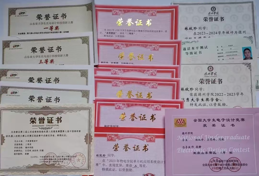 基于对电子科技的热爱,林纹珍格外注重科创能力以及团队协作能力的培养,她大一就加入创新发明实验室进行相关学习。在老师的耐心指导和同学们的共同努力下,多次在创新比赛中获得奖项,曾获:山东省大学生光电设计科技创新大赛省级一等奖;2024年TI杯全国大学生电子设计竞赛省级三等奖;第十五届蓝桥杯全国软件和信息技术大赛省级三等奖;第七届高校智能机器人创意大赛省级三等奖;2024年 ican大学生创新创业大赛省级三等奖等,共获得省级奖项5项,校级奖项10余项。