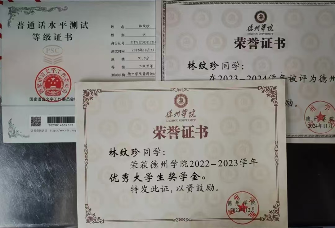 林纹珍脚踏实地,始终谨记学习是学生的第一要务,有着明确的学习目标和学习态度,始终坚信“厚积而薄发”,保持着对学习的热情和专注,扎实学习。作为一名物电学子,她刻苦努力,积极进取,既要求自己学好理论知识,也督促自己走向实践,最终在老师、同学们的指导和帮助下,她取得理想的成绩:学业成绩和综合成绩均稳居专业第一,并获得国家奖学金、2022-2023学年获得德州学院优秀大学生奖学金、德州学院“三好学生”等荣誉称号。并在“学霸宿舍经验分享会”中,分享自己的学习经验给学弟学妹,充分发挥榜样示范和朋辈引领的双重作用。