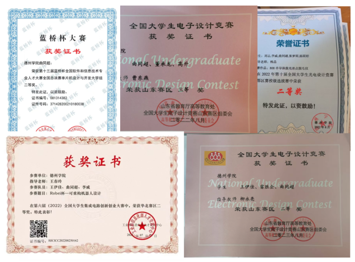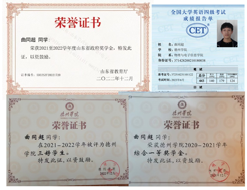自大二起,曲同超便致力于学术竞赛,以创新为翼,以实践为舟。他参与了众多学科竞赛,在团队合作中不断超越自我。凭借坚实的专业基础和严谨的探究精神,他屡次取得优异成绩:荣获第十三届蓝桥杯全国总决赛二等奖、第六届全国大学生集成电路创新创业大赛华北赛区二等奖、2023年全国大学生电子设计竞赛山东赛区二等奖、2022年全国大学生电子设计竞赛山东赛区三等奖、以及2022年光电设计大赛校级一等奖等多项荣誉。